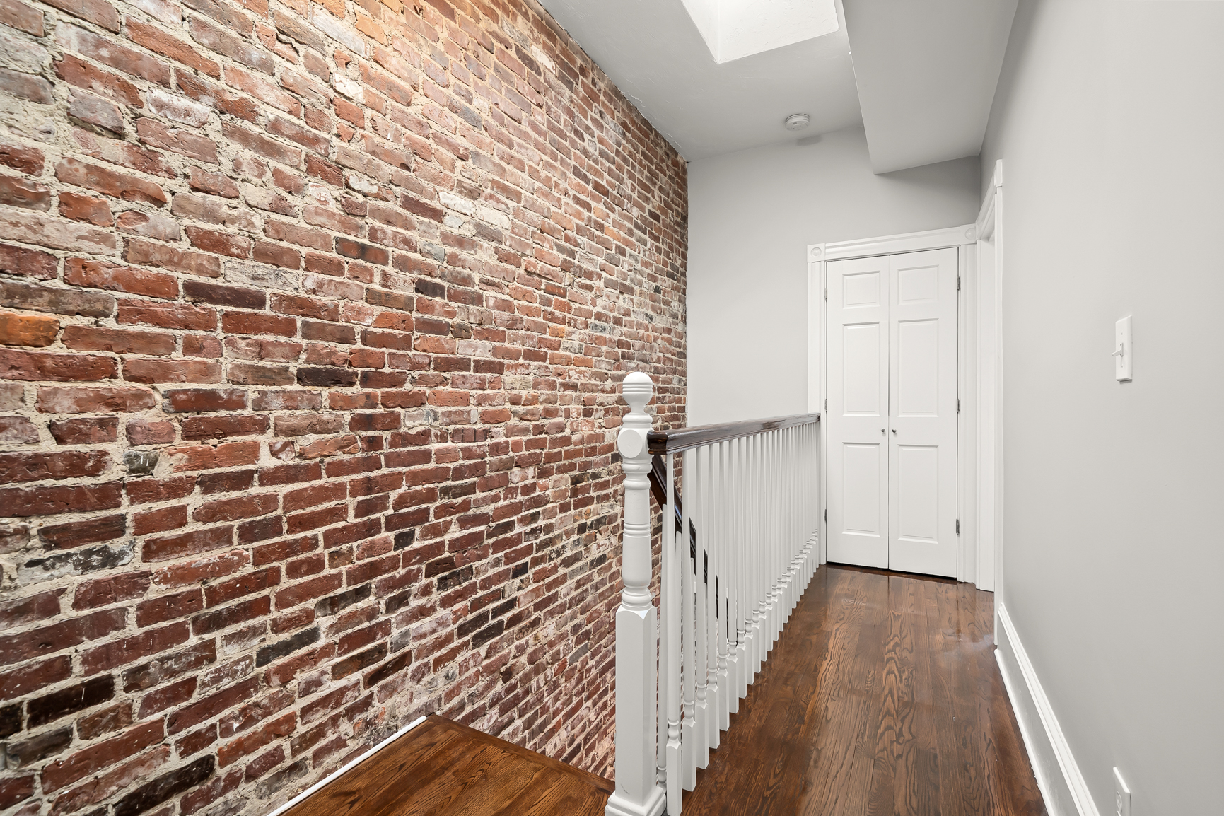 Exposed brick - an original feature framing the foyer and stairway that gives this home unmatched character