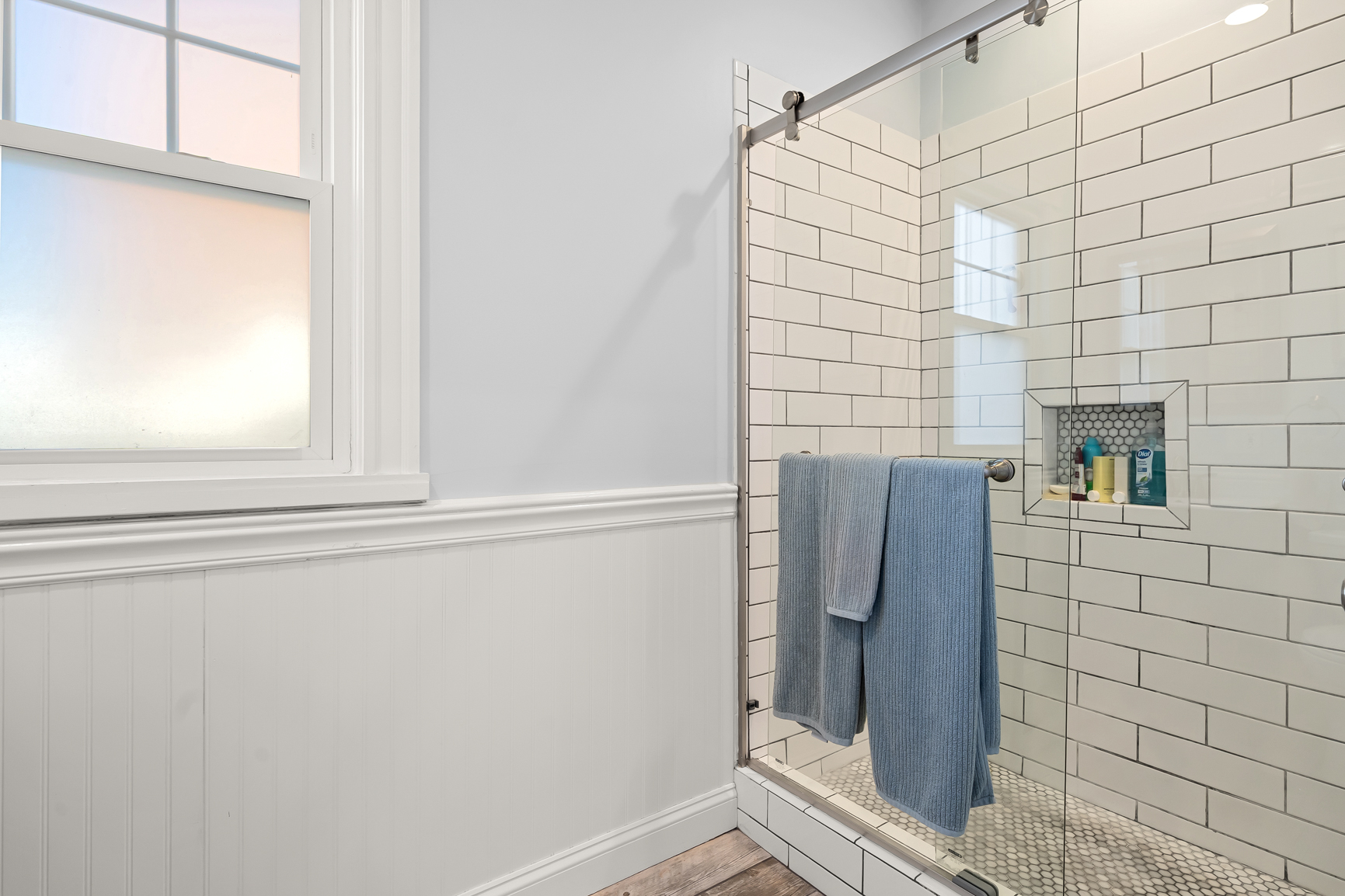 Fully renovated bathrooms - Crisp, contemporary, floor-to-ceiling tile with modern fixtures